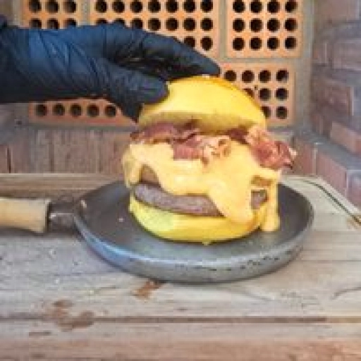 Pão brioche, dois blends bovinos de 150g, molho cheddar artesanal, bacon crocante, queijo muçarela derretido e maiones... Ver completo