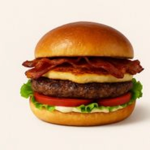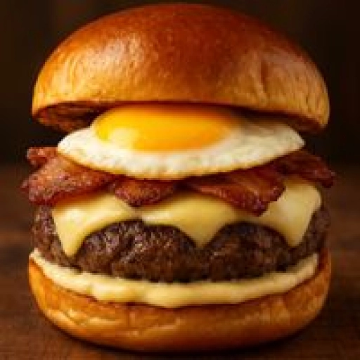 Pão brioche, blend bovino de 150g, queijo muçarela, ovo, bacon crocante e maionese do chef.