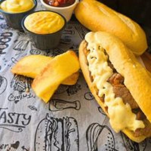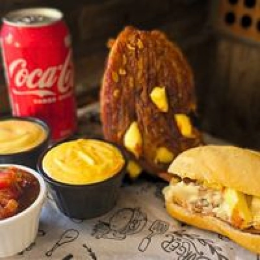 Pão baguete 20 cm, cupim desfiado, queijo coalho, banana frita e molho da casa.