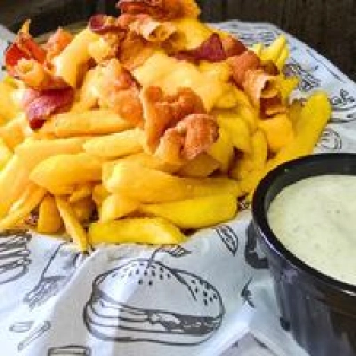 Desfrute de nossa primorosa porção de Batata com Cheddar e Bacon, pesando 300g.